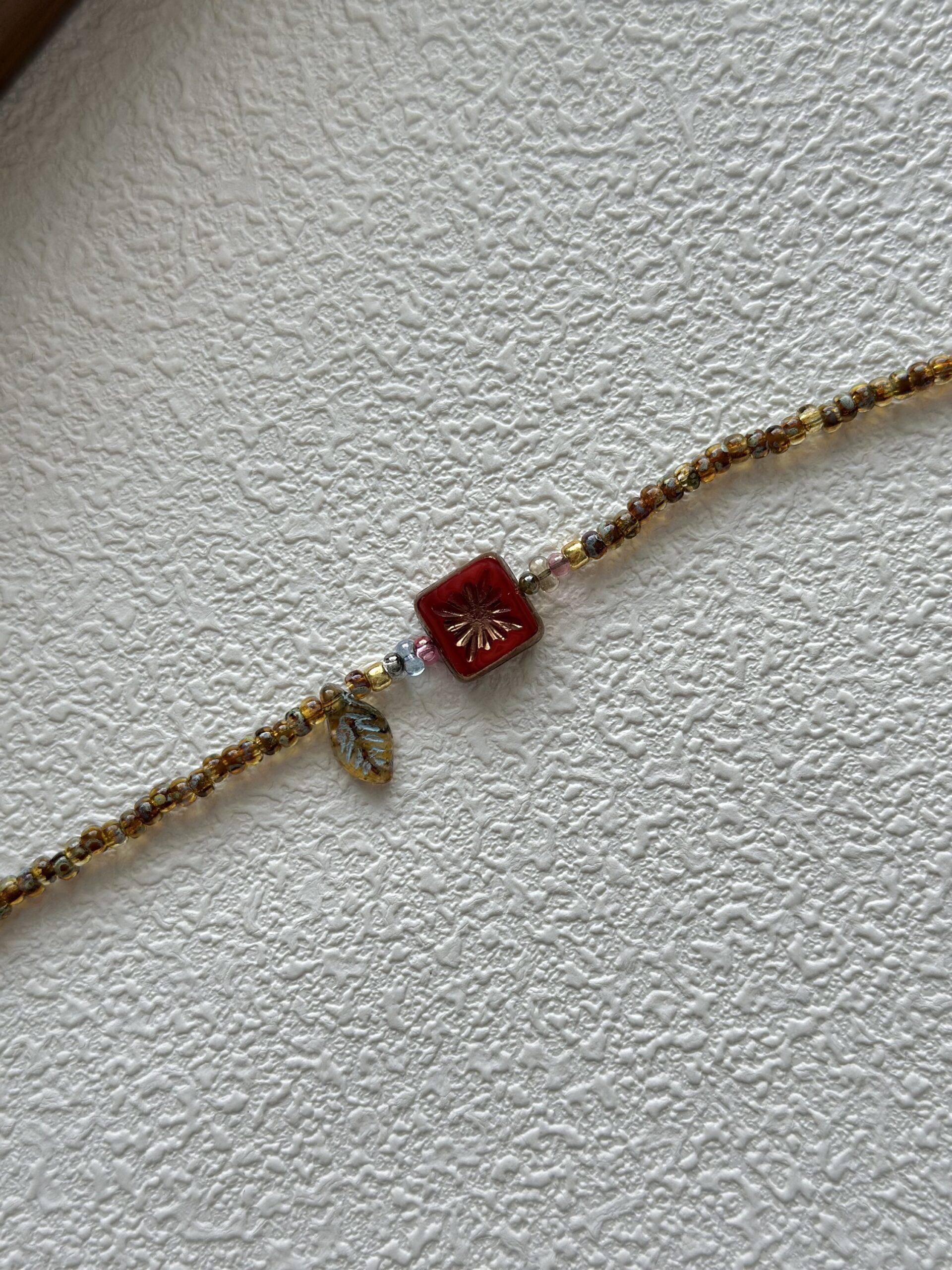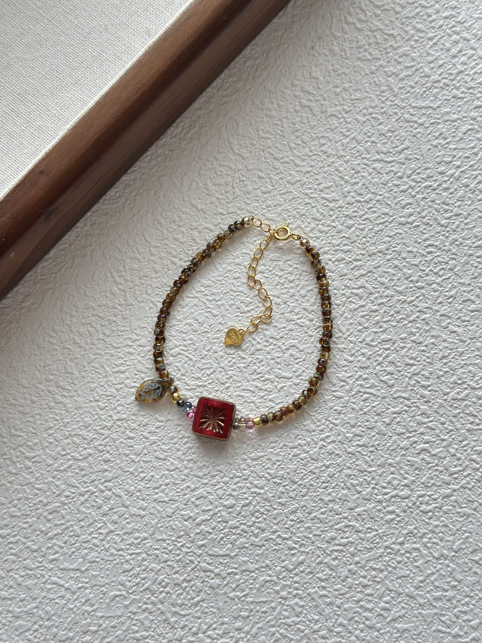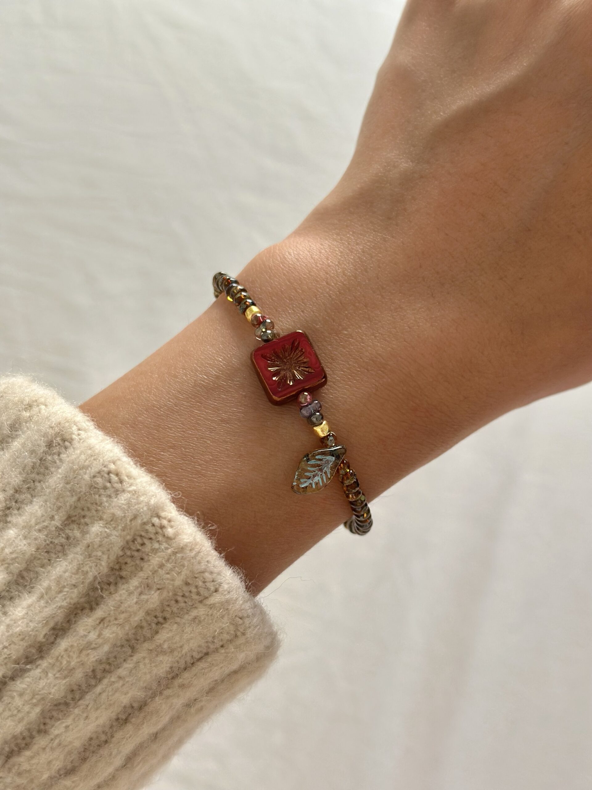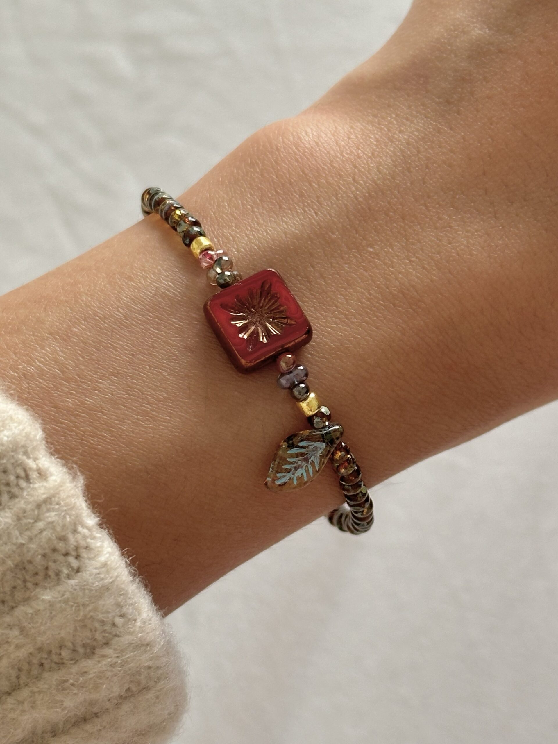 Bransoletka Jesienny Błysk została zainspirowana pierwszymi dniami jesieni. Jej głównym elementem jest pojedynczy, głęboko czerwony czeski szklany koralik typu „firework”, który symbolizuje ognisty akcent jesiennych liści. Obok koralika znajduje się delikatny motyw liścia, przypominający spadające liście wczesnej jesieni, podkreślający naturalny i ciepły charakter biżuterii.