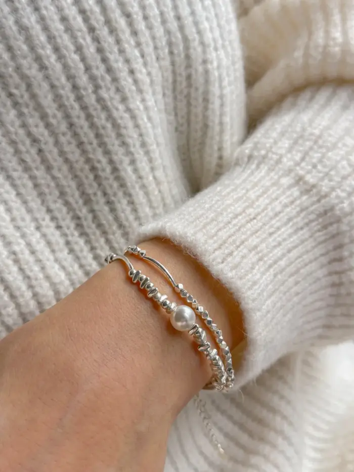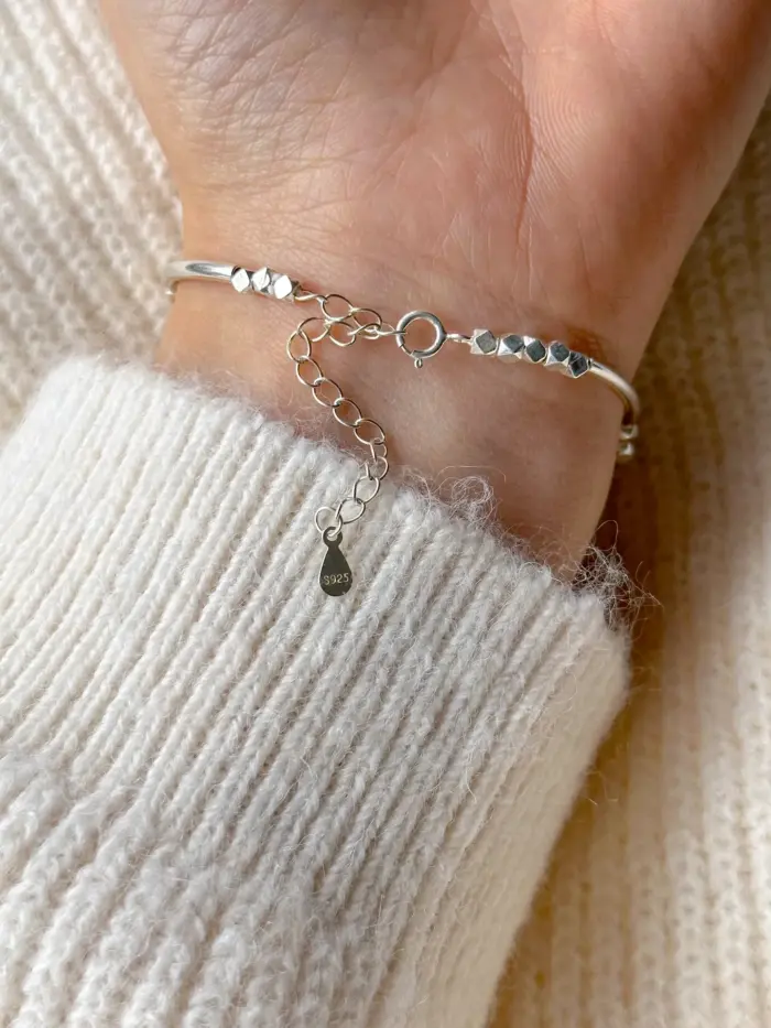 Bransoletka usztywniana z kawałkami srebra to piękny i uniwersalny dodatek, który emanuje subtelnością i elegancją. Minimalizm oparty na kawałkach srebra idealnie komponuje się z różnymi kreacjami dodając im wyjątkowego uroku. Ten model na pewno doda elegancji Twojemu nadgarstkowi i przyciągnie uwagę swoim pięknem.