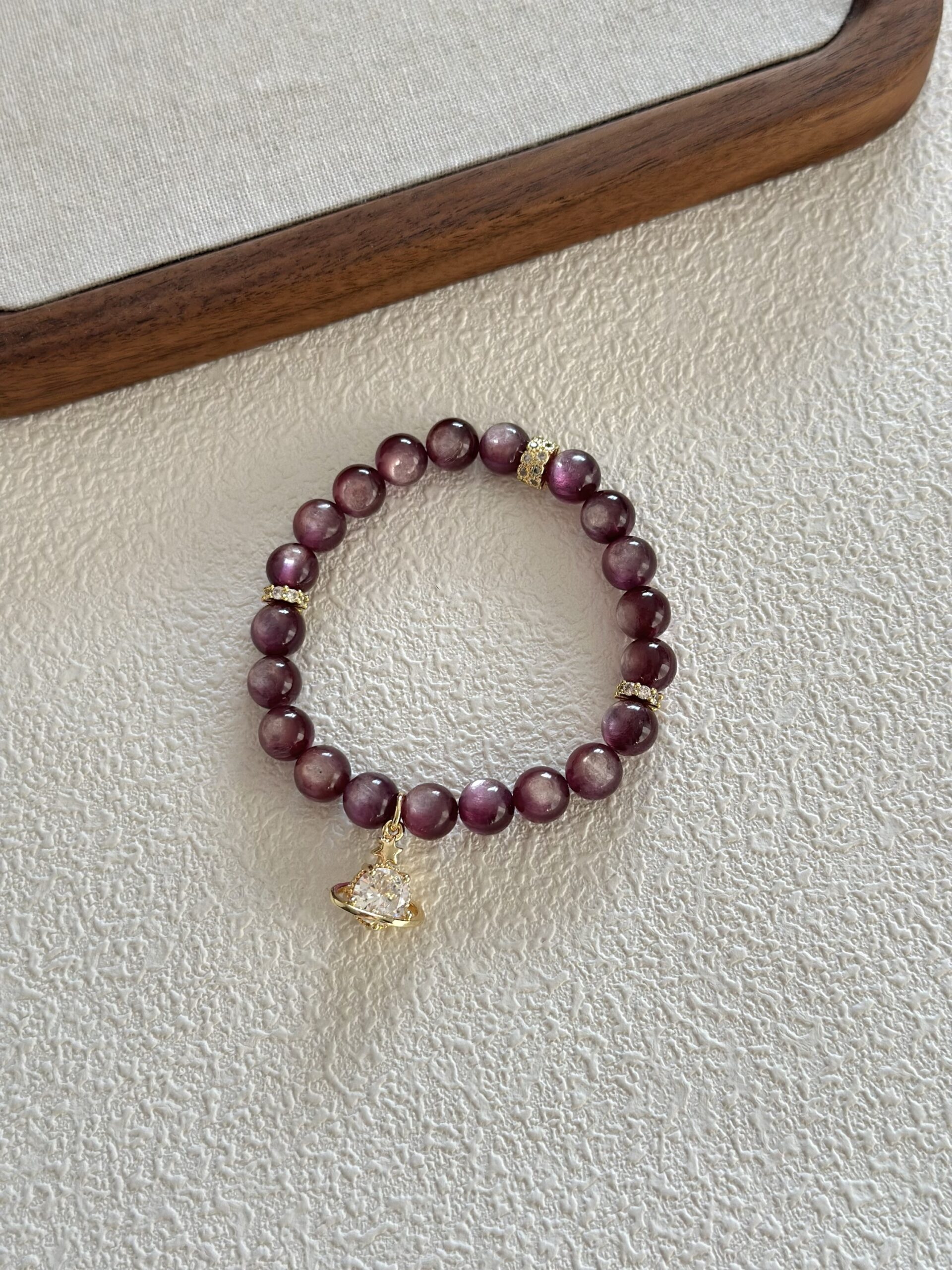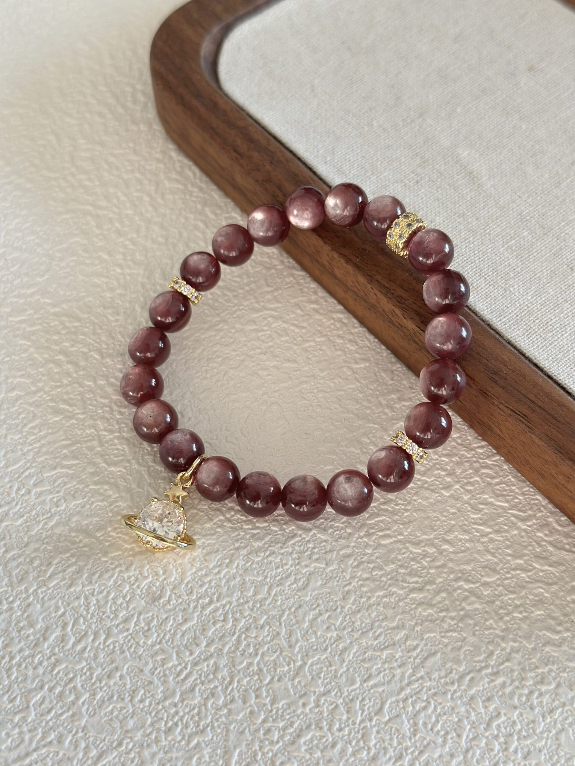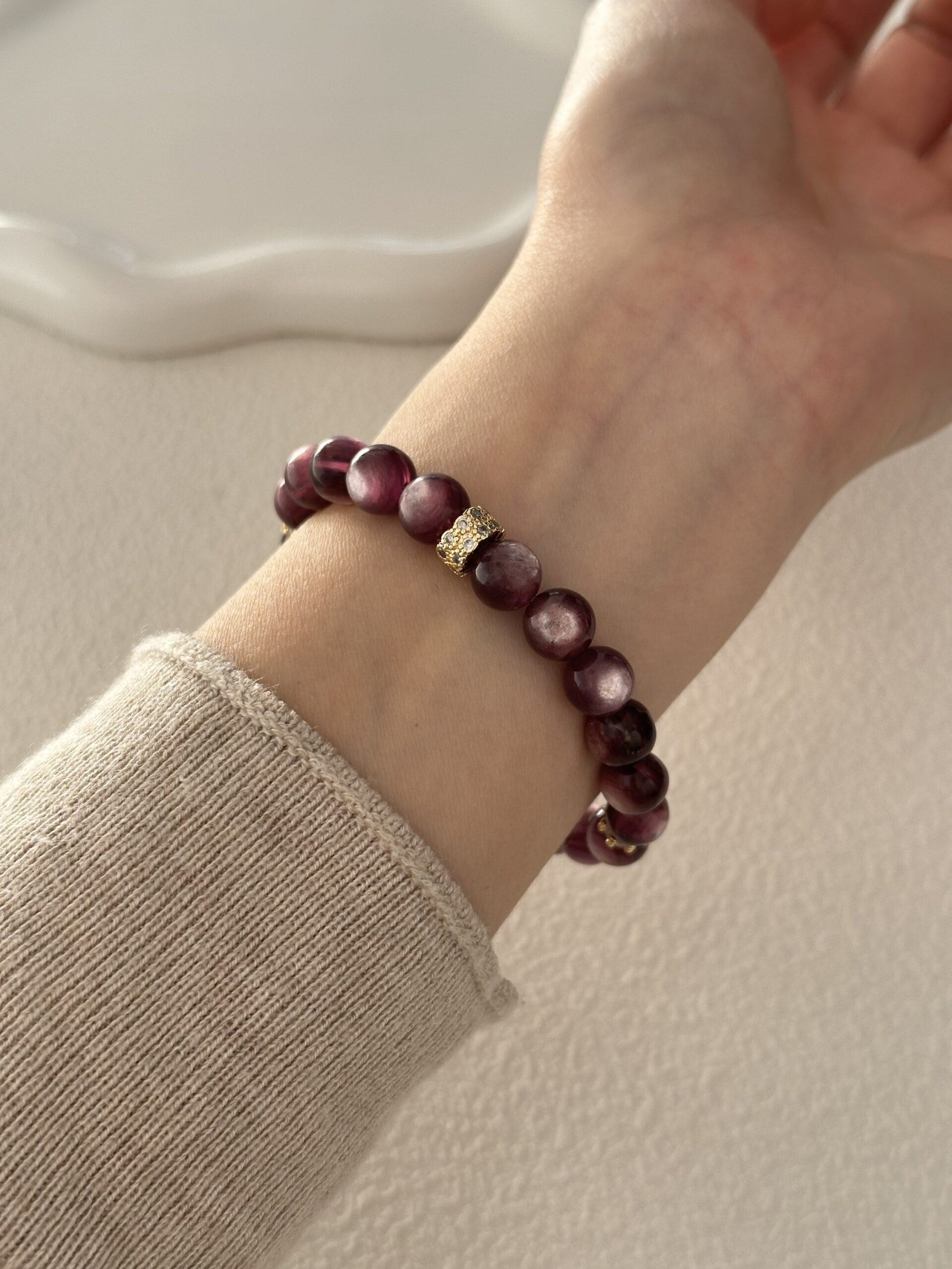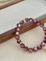 Bransoletka z kamieni lepidolitu o wymiarach 8mm to harmonijne połączenie naturalnego kamienia ze złoconymi detalami i subtelnymi akcentami cyrkonii. Delikatna kolorystyka lepidolitu w odcieniach fioletu i pudrowego różu nadaje biżuterii lekkości i spokojnego charakteru, a złocone elementy dodają jej wyrafinowanego wyglądu.