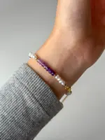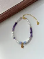 Urocza bransoletka z zawieszką w kształcie misia, zdobiona 14K złotymi akcentami wykonanymi w technologii gold-filled, łączy w sobie ametyst, naturalne perły oraz niebieski agat. Ametyst, ceniony jako kamień spokoju i równowagi, wnosi do kompozycji harmonię i wyciszenie. Niebieski agat, znany ze swojego działania ochronnego, dodaje poczucia bezpieczeństwa i stabilności, podkreślając przy tym elegancję bransoletki. Perły dodają subtelnego blasku, symbolizując czystość i ponadczasową elegancję. Całość dopełnia zapięcie ze srebra 925, pozłacane 18K złotem.