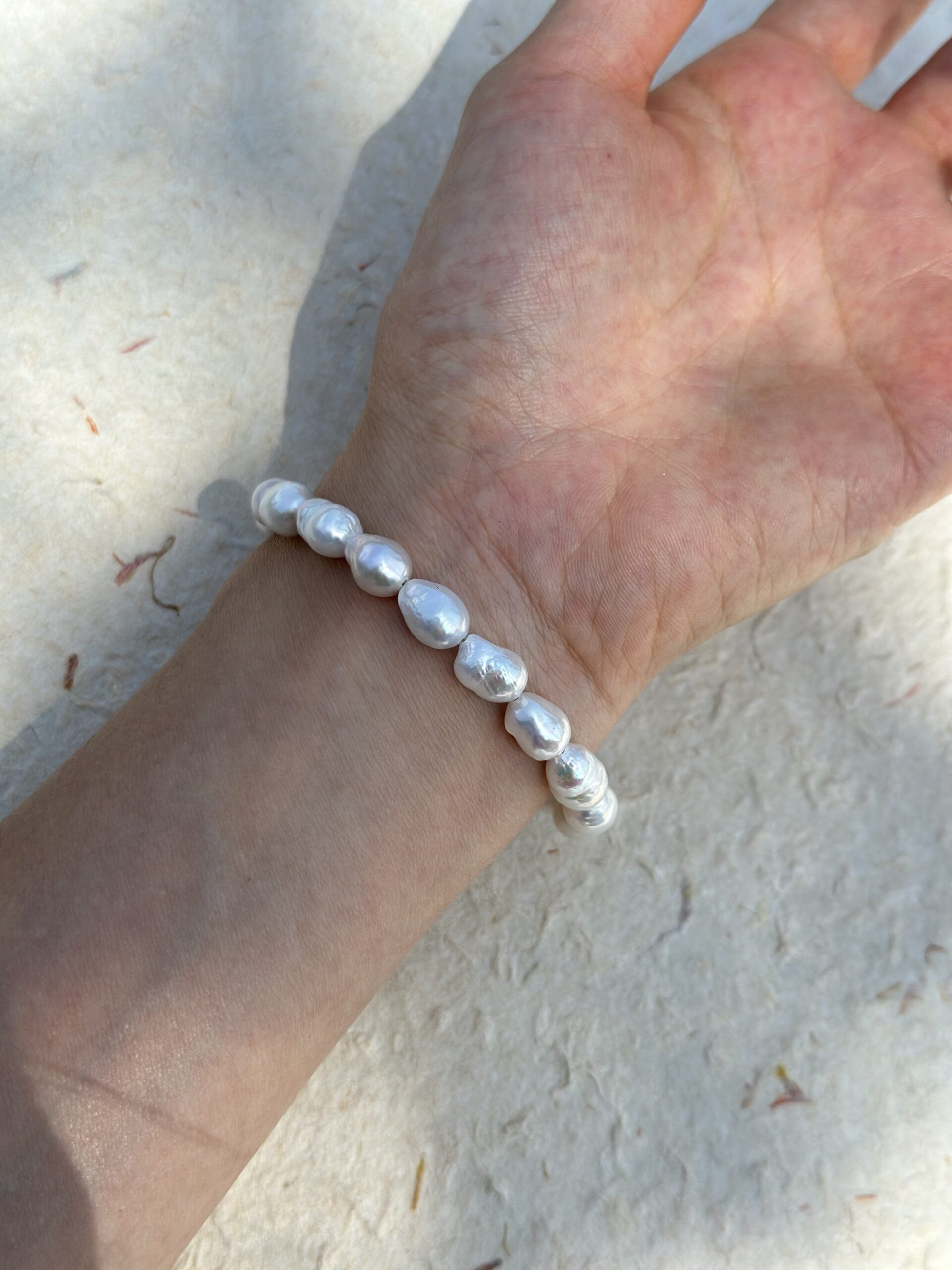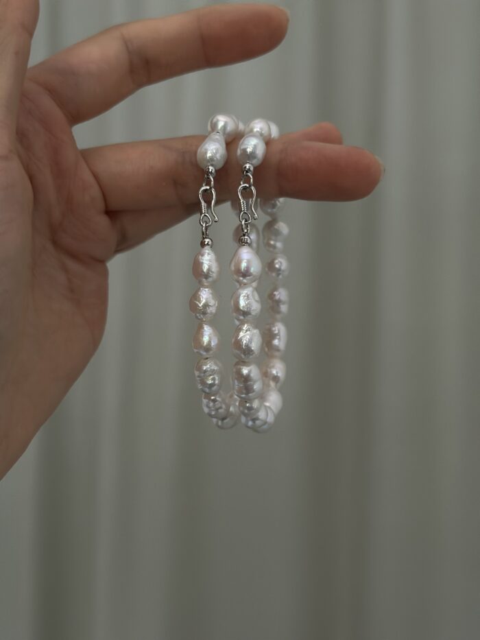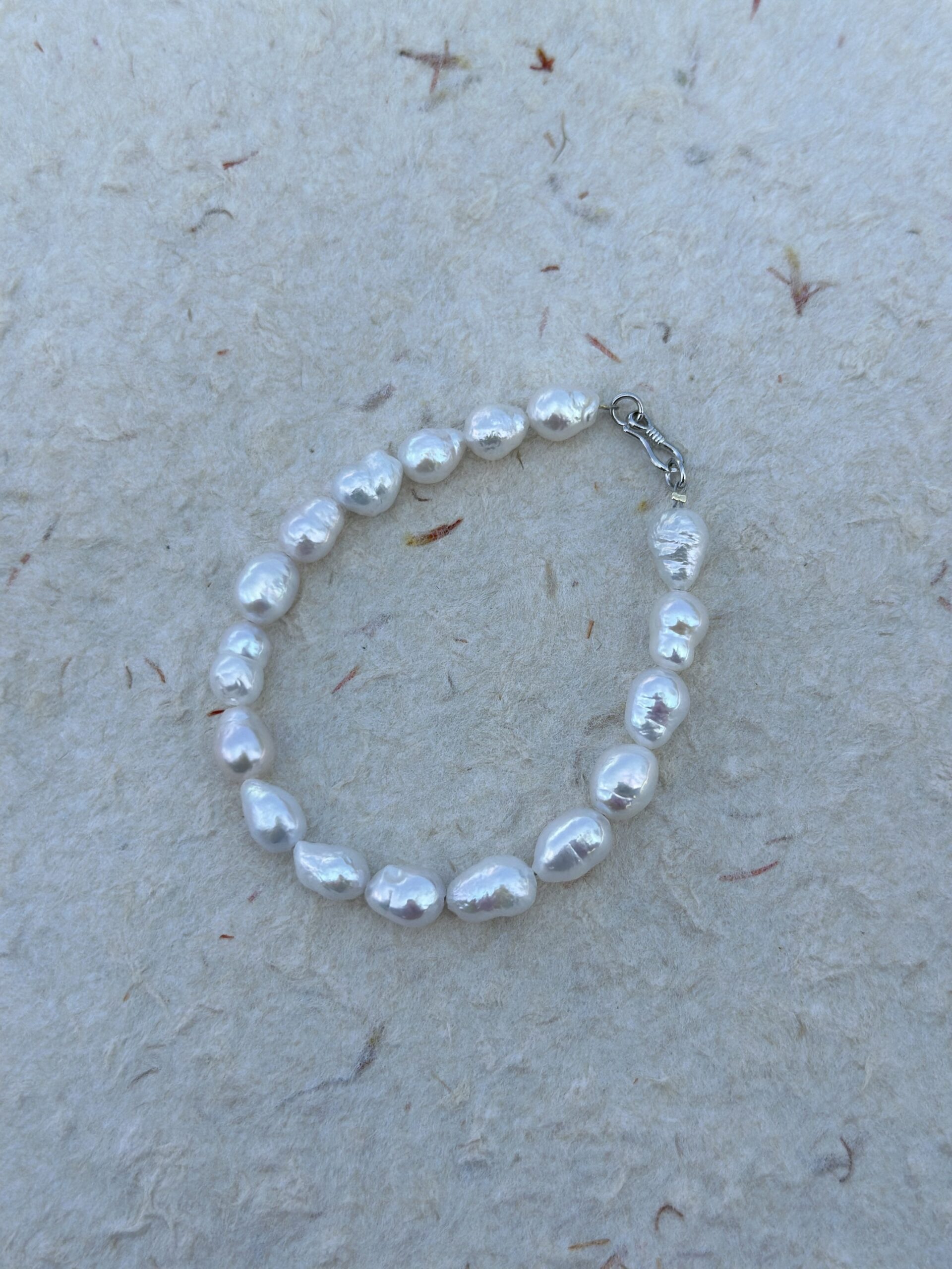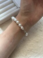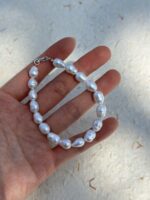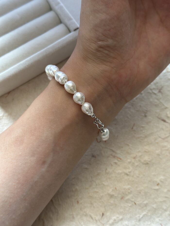 Delikatna bransoletka składająca się z nieregularnych perełek słodkowodnych 7-8mm w kształcie kropli. Każda perła ma swój naturalny, barokowy charakter, co sprawia, że bransoletka wygląda subtelnie, a jednocześnie wyjątkowo. Jej naturalny połysk pięknie odbija światło przy każdym ruchu ręki. Srebrne zapięcie podkreśla minimalizm i elegancję. Idealna na co dzień – świetnie komponuje się z zegarkiem, innymi bransoletkami lub noszona solo jako minimalistyczny dodatek.