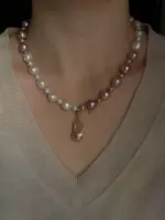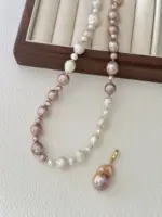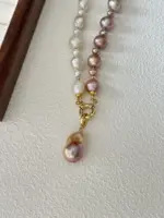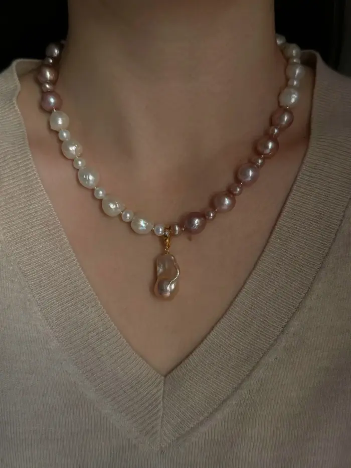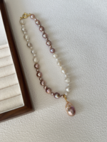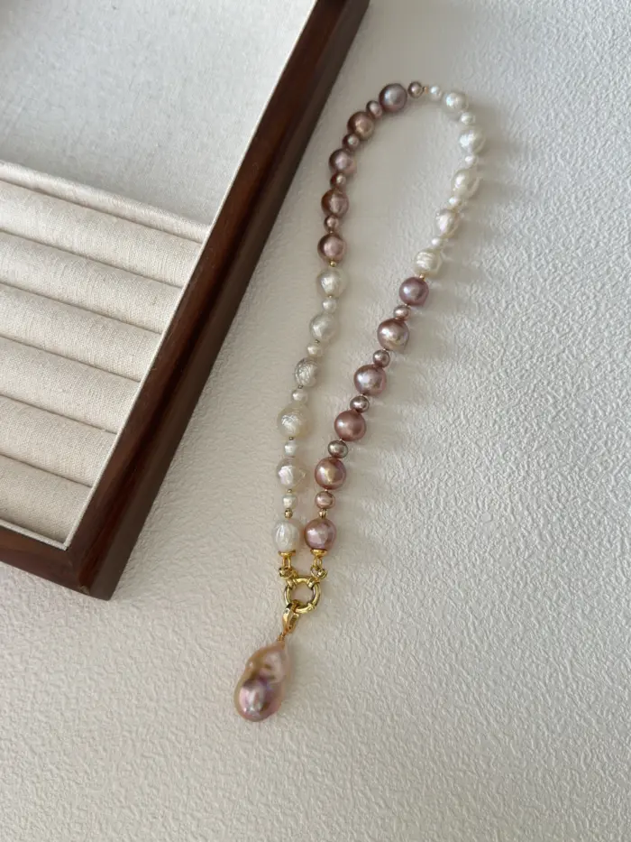 Ten modułowy naszyjnik to kompozycja przypominająca szachownicę z czterech rodzajów pereł w subtelnych odcieniach bieli i fioletu, które doskonale podkreślają naturalne piękno tej biżuterii. Każda perła, od delikatnych tonów jasnego fioletu po klasyczną biel, wnosi niepowtarzalny charakter i tworzy harmonijną całość. Odpinana zawieszka z barokowej perły oraz dodatkowe elementy S925 pokryte 24K złotem, umożliwiają personalizację i dodają naszyjnikowi wyjątkowego wyrazu. Akcenty wykonane w technologii 14K gold-filled dodają luksusowego blasku i trwałości. To idealne połączenie klasycznej elegancji z nowoczesnym designem.