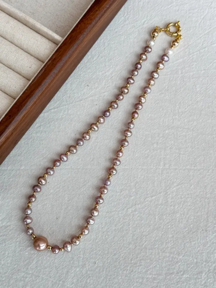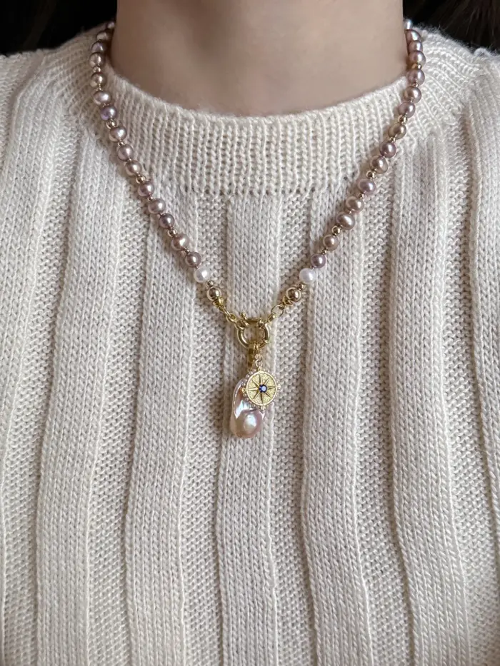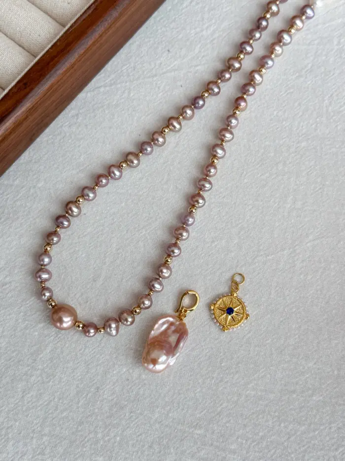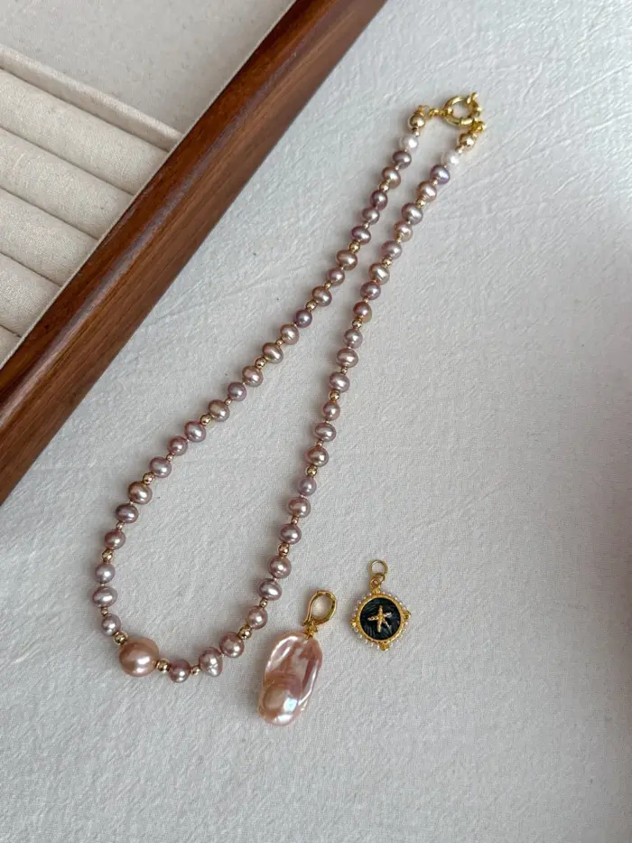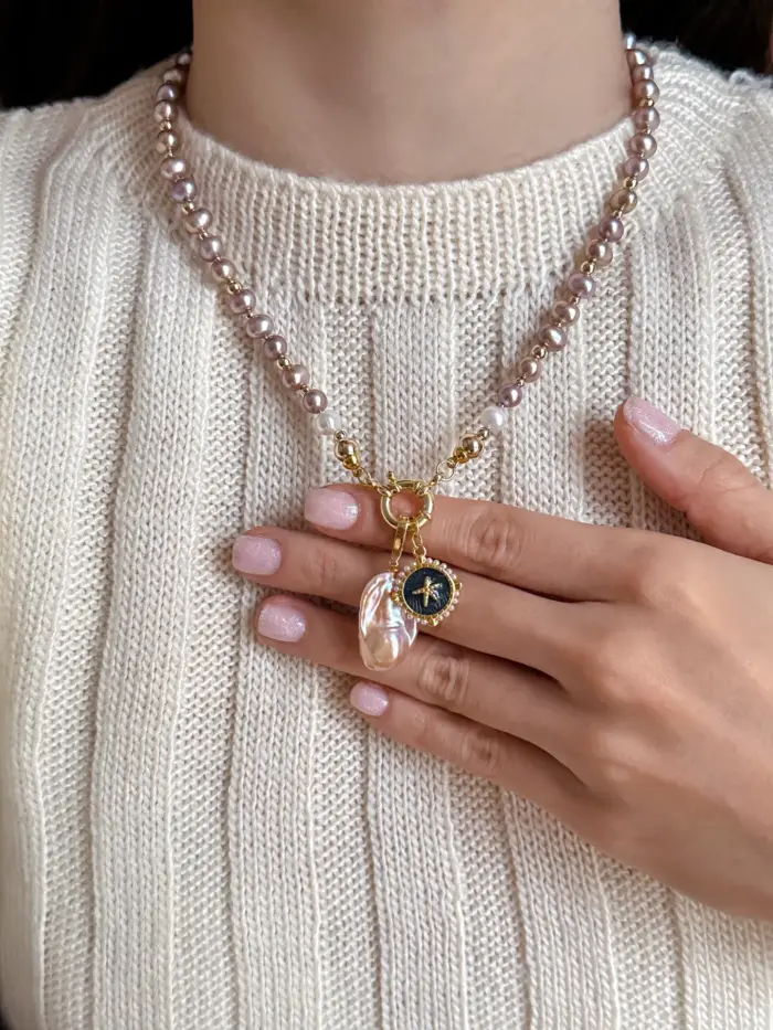 Ten modułowy naszyjnik to harmonia kolorów i faktur, które podkreślają naturalne piękno pereł. Wykonany z czterech rodzajów pereł w subtelnych odcieniach fioletu i bieli, przyciąga wzrok swoją różnorodnością i elegancją. Naturalny kolor każdej perły – od tajemniczego fioletu po klasyczną biel – dodaje naszyjnikowi unikalnego charakteru, który trudno przeoczyć. Odpinana zawieszka z barokowej perły oraz dodatkowa zawieszka S925 pozłacanego 24K złotem, ozdobiona granatowymi akcentami, pozwalają na personalizację i nadają całości wyjątkowego wyrazu. Całość dopełniają kulki wykonane w technologii 14K gold-filled, wprowadzając nutę luksusu i elegancji. To biżuteria, która idealnie łączy naturalne piękno z nowoczesnym designem.