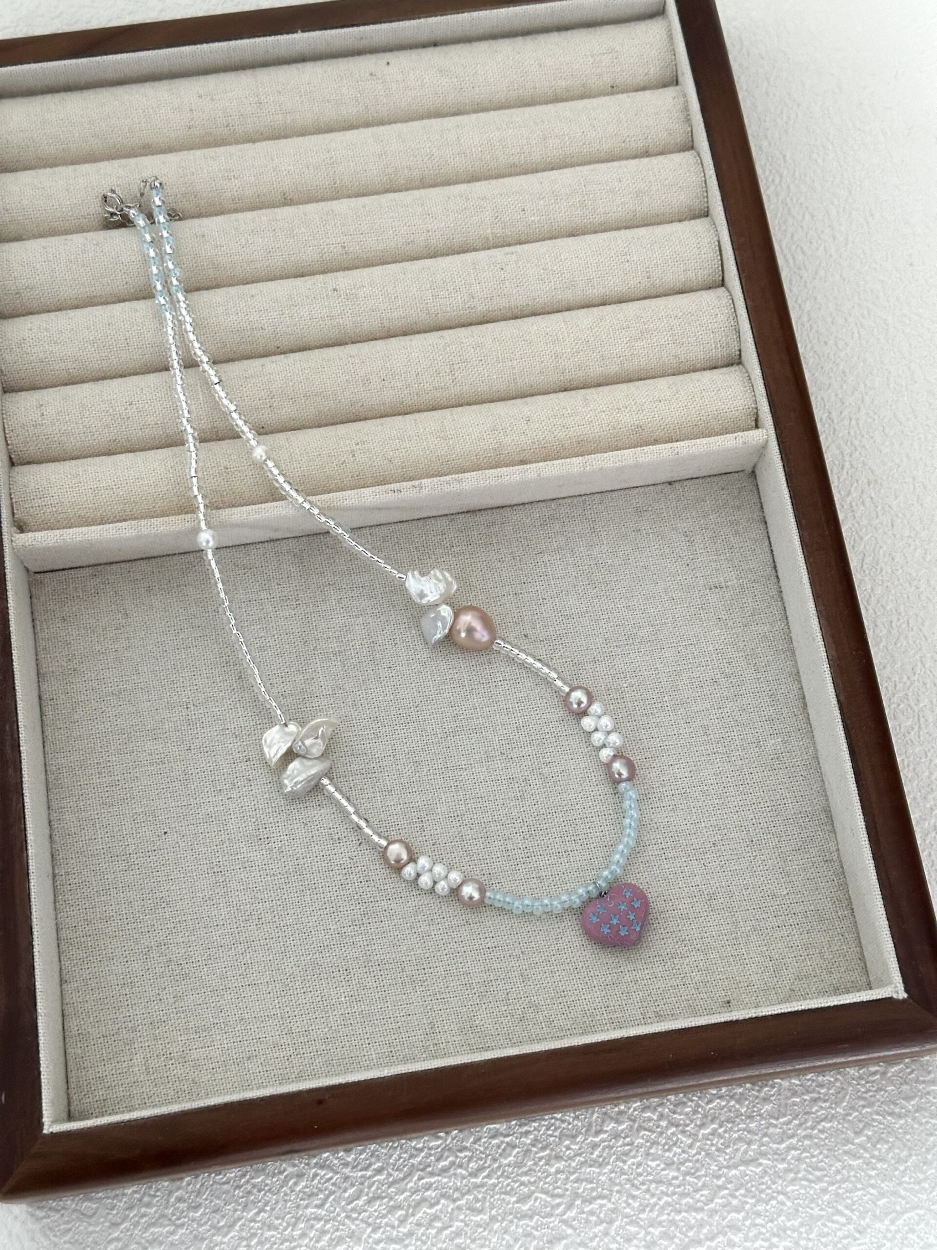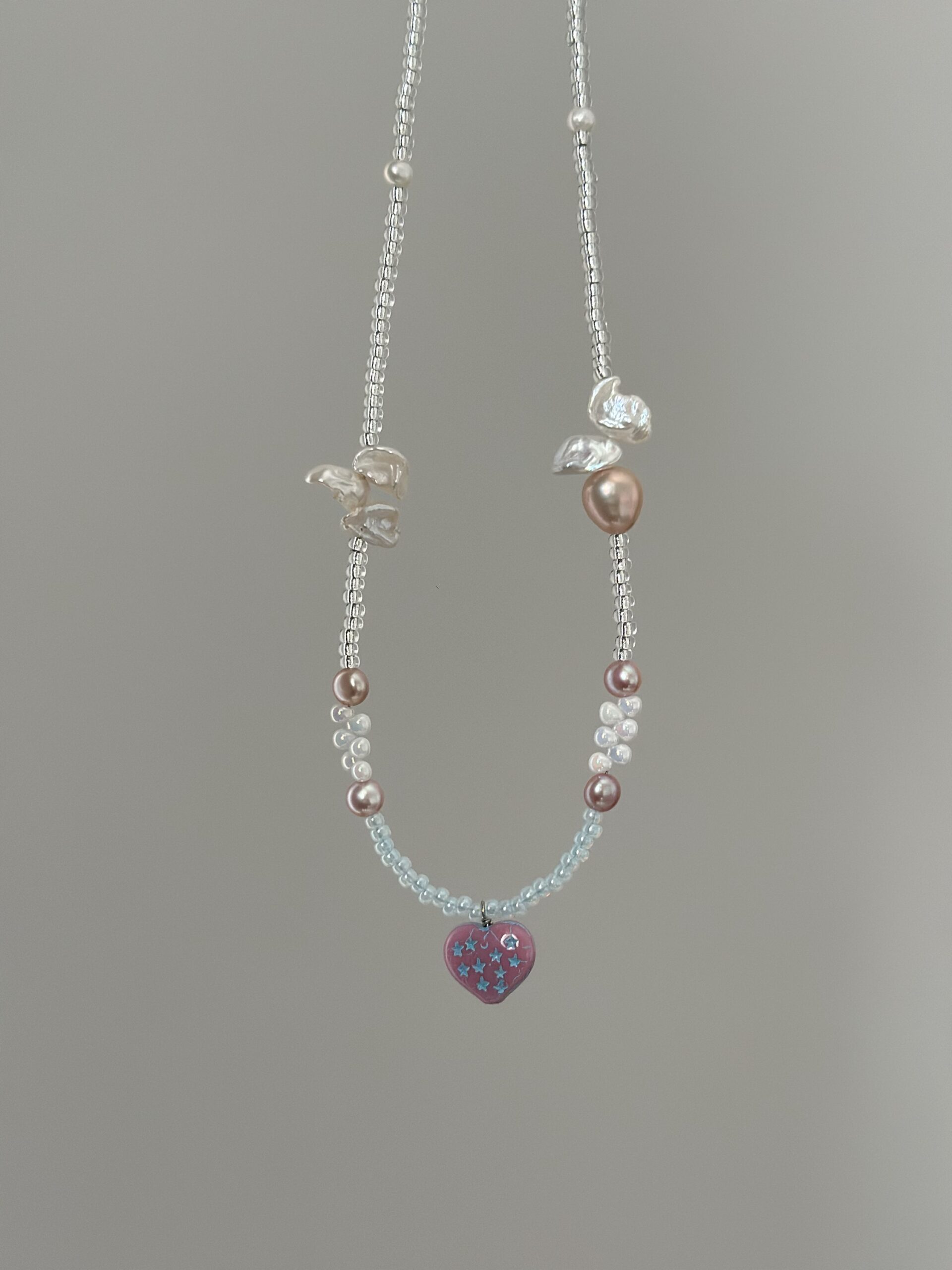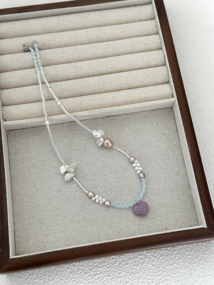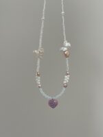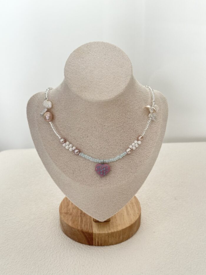 Kreatywny miks dla tych, którzy kochają kolor! Połączyliśmy tu różnorodne perły z radosnymi czeskimi koralikami i zawieszką w kształcie serca. To bardzo autorski projekt, który przełamuje nudę i dodaje stylizacji „pazura” w wersji słodkiej. Świetnie wygląda nawet do zwykłego białego t-shirtu.