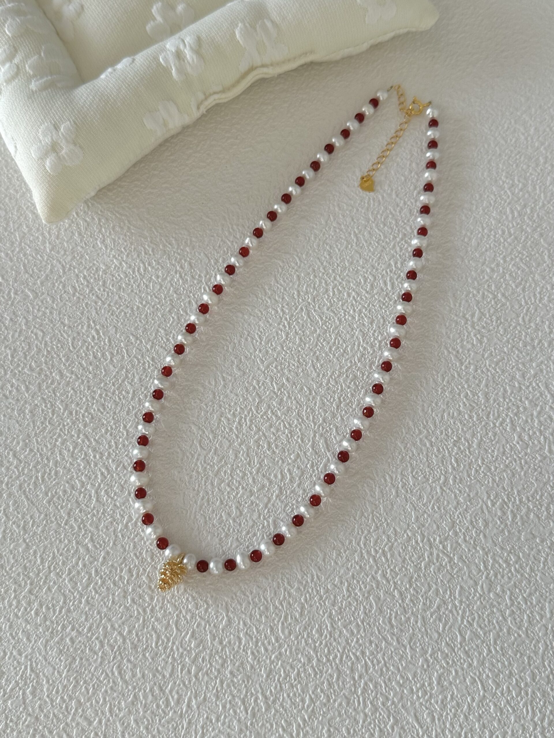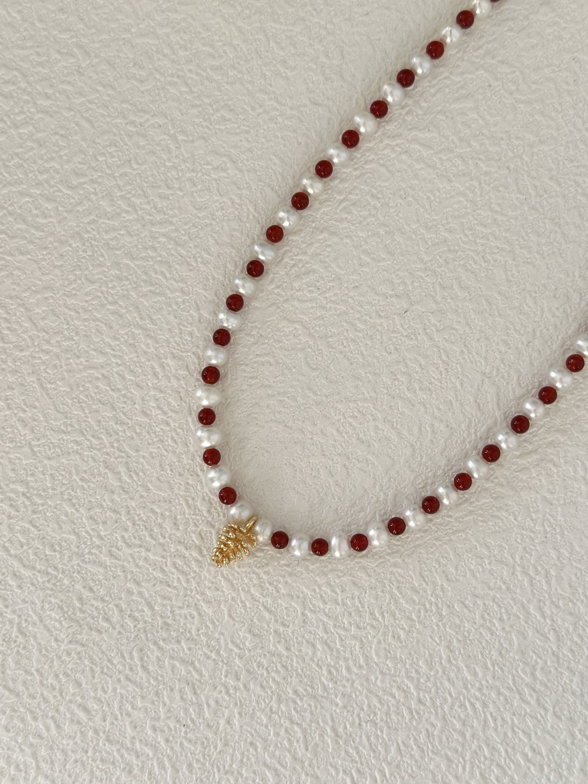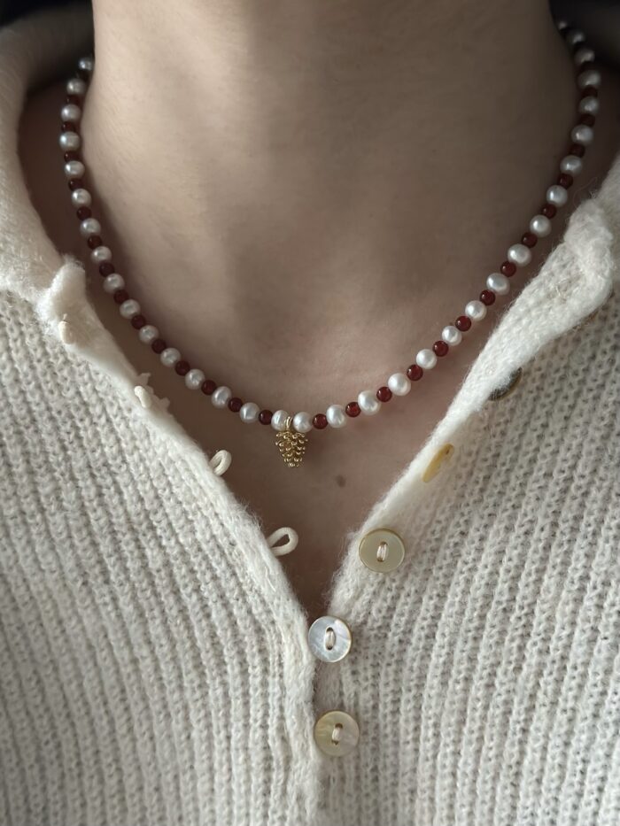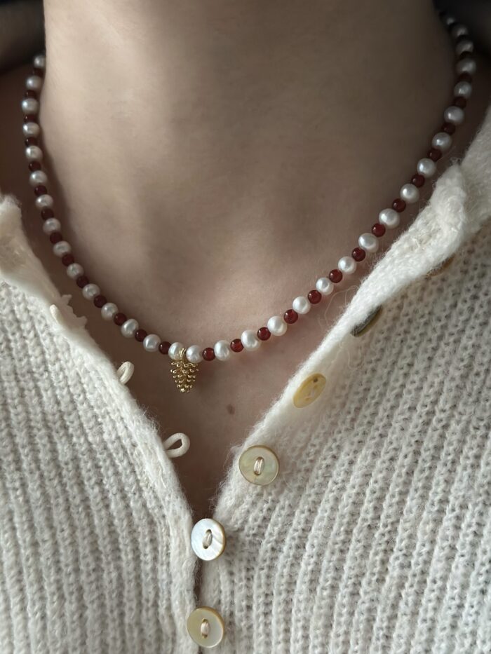 Ten naszyjnik to idealne połączenie klasyki i charakteru. Subtelne, białe perły spotykają się tu z intensywną energią czerwonych koralików z agatu, tworząc kompozycję, która przyciąga wzrok, ale pozostaje elegancka. Złocony element w centrum dodaje całości szlachetnego blasku. Co najważniejsze, dzięki regulowanemu łańcuszkowi naszyjnik idealnie dopasuje się do każdego dekoltu. Świetnie sprawdzi się zarówno do ulubionej koszuli, jak i do wieczorowej kreacji. To biżuteria stworzona, byś czuła się w niej pięknie każdego dnia. Do tego naszyjnika mamy również pasującą bransoletkę, z którą stworzysz idealny komplet!