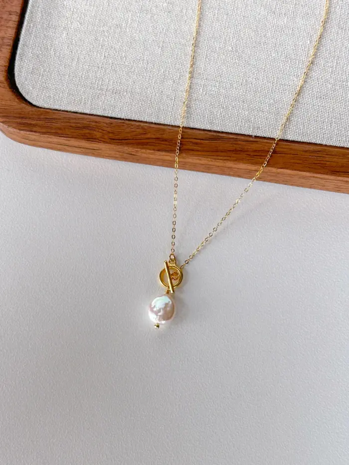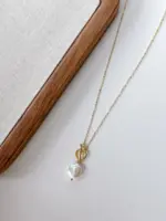 Ten naszyjnik to połączenie naturalnego piękna i swobodnej elegancji. W centrum znajduje się okrągła perła barokowa o wielkości 10-11mm, która zachwyca swoim kształtem i delikatnym blaskiem. Złote elementy wykonane w technologii 14K gold-filled podkreślają luksusowy charakter naszyjnika, zapewniając jednocześnie trwałość i wysoką jakość wykończenia. Dzięki temu naszyjnik świetnie sprawdzi się zarówno na co dzień, jak i na wyjątkowe okazje, będąc doskonałym dodatkiem do każdej stylizacji.