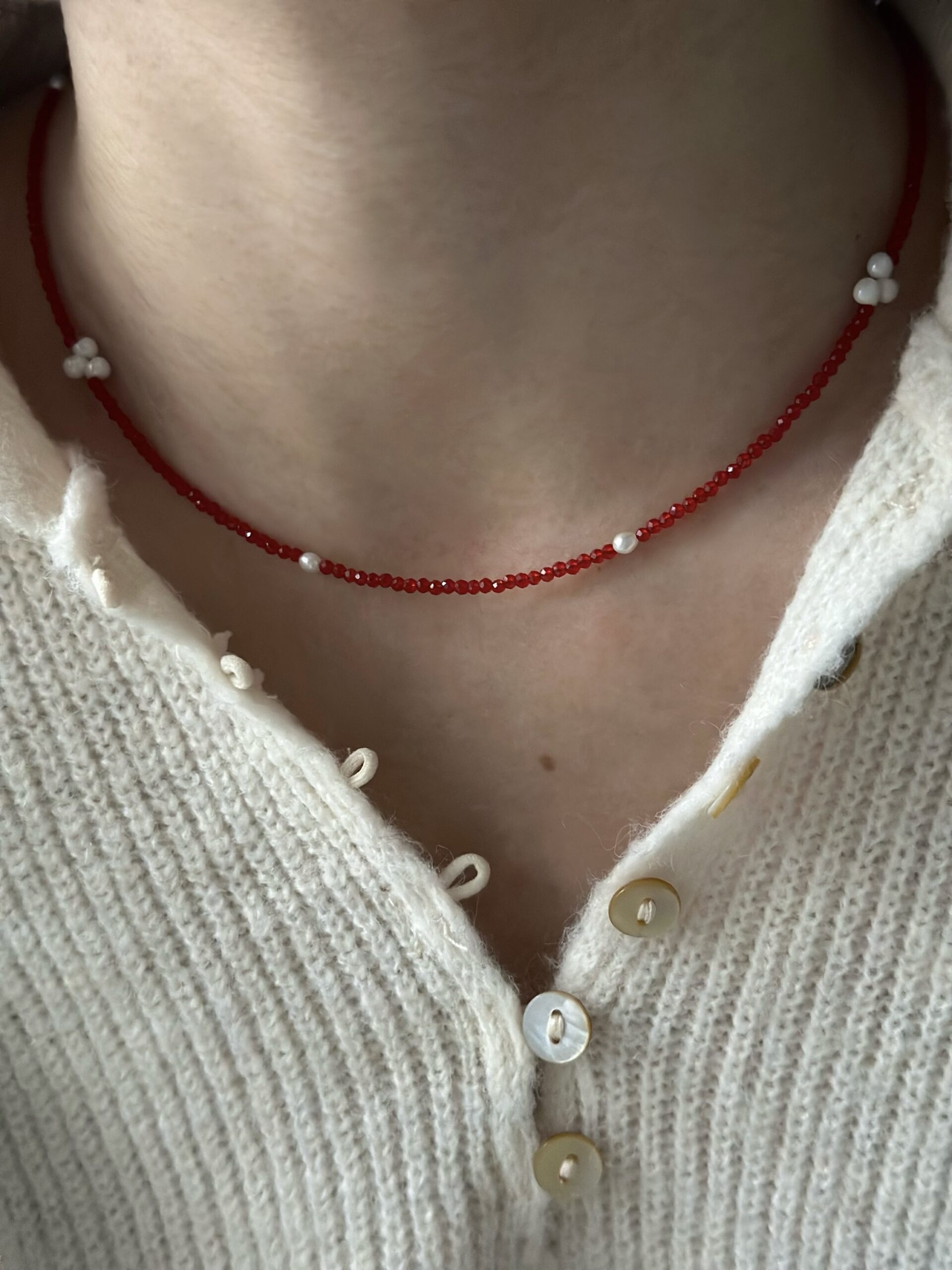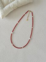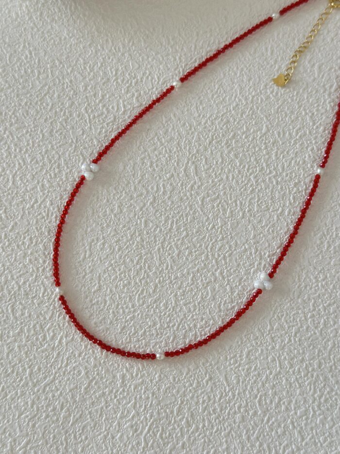 Ten naszyjnik idealnie zdecydowanie przykuwa wzrok. Jego minimalistyczna linia, stworzona z gęsto nawleczonych drobnych czerwonych koralików, jest pięknie przełamana akcentami większych, klasycznych białych pereł.