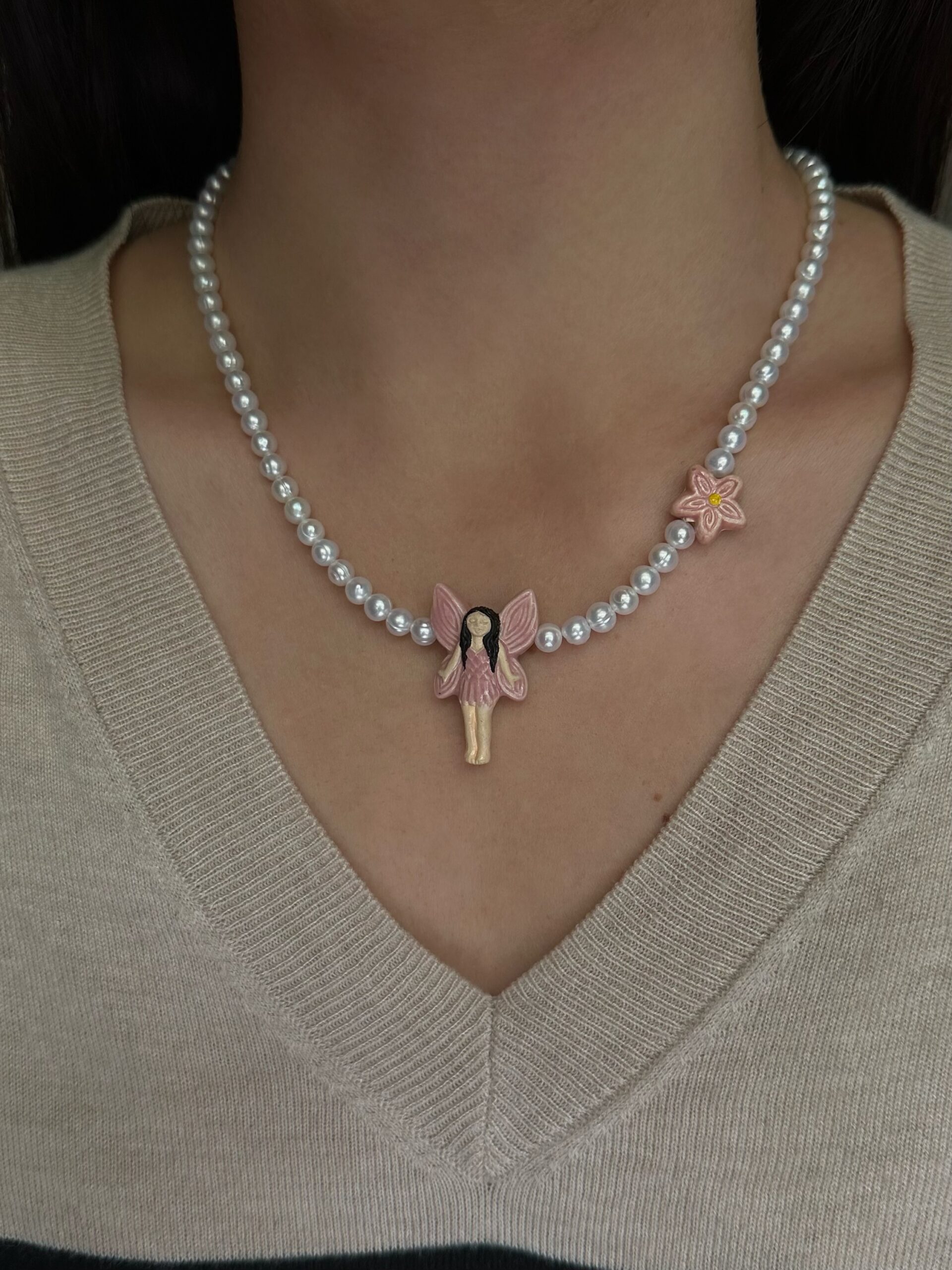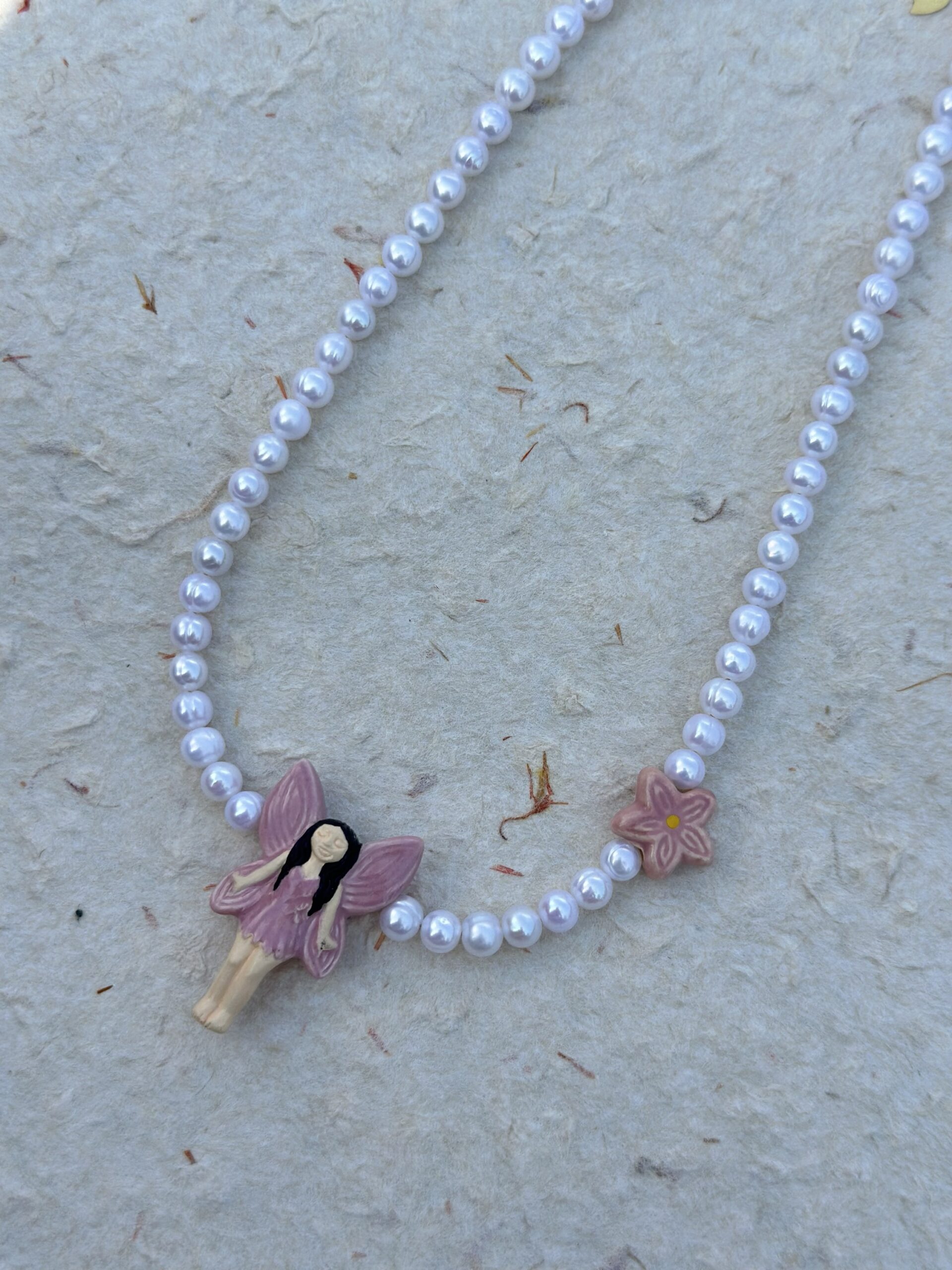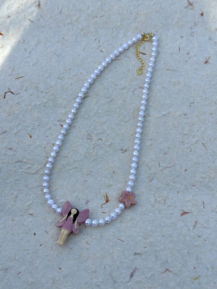 Krótki naszyjnik z drobnych perełek słodkowodnych 5-6mm z uroczymi zawieszkami – wróżką i kwiatuszkiem z ręcznie wykonywanej ceramiki z Peru. Lekki, dziewczęcy design – idealny jako słodki akcent do casualowych looków.