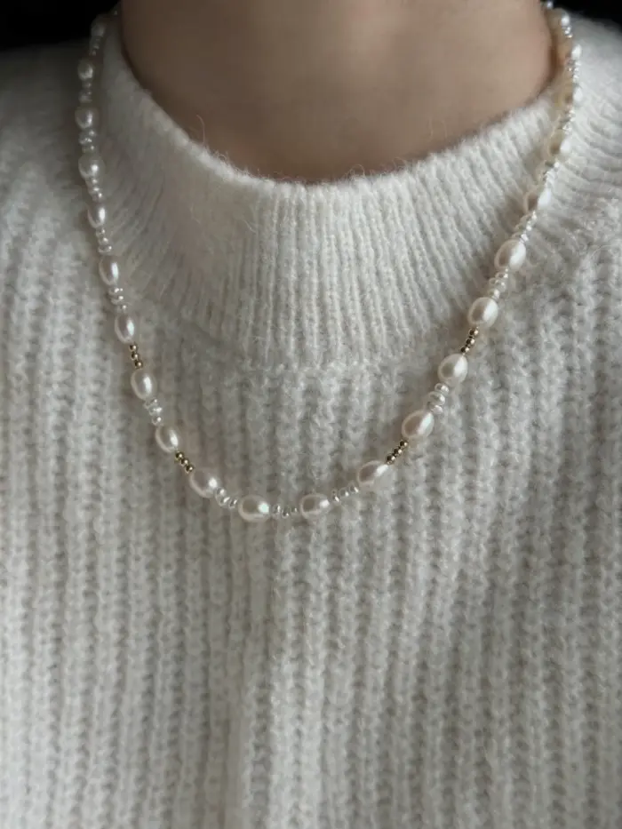 Ten naszyjnik łączy delikatne perły w kształcie kropli o wielkości 6 mm z subtelnymi 14K złotymi kulkami wykonanymi w technologii gold-filled. Dodatkowe mini perełki o średnicy 3 mm nadają kompozycji lekkości i elegancji. Całość dopełnia delikatne zapięcie wykonane ze srebra próby S925, co dodaje więcej złotych akcentów. Ten naszyjnik to harmonijne połączenie różnorodnych elementów, które tworzą wyjątkowy i ponadczasowy dodatek do każdej stylizacji.