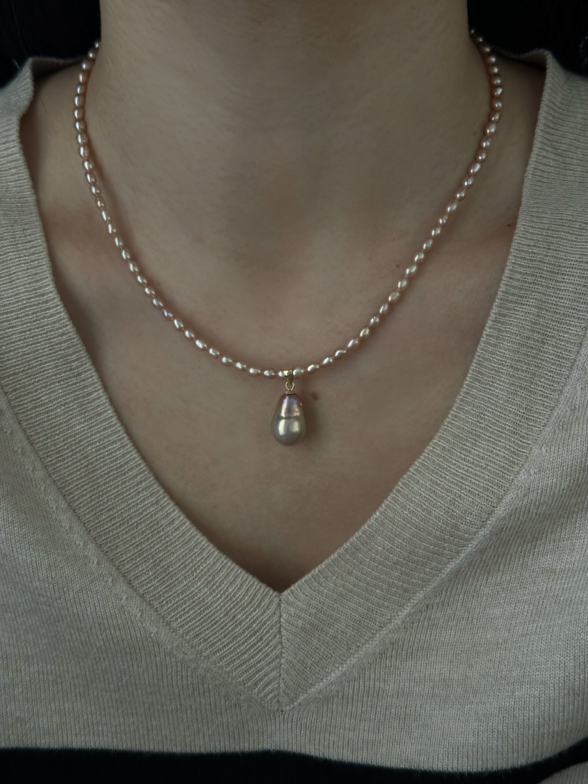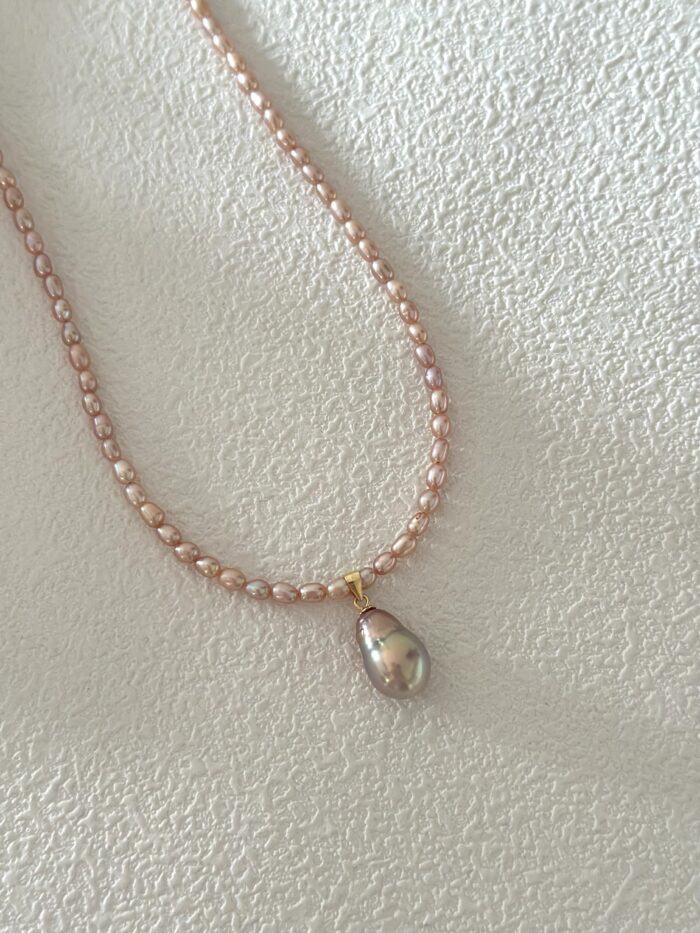Naszyjnik z różowych pereł z zawieszką to delikatna i kobieca biżuteria, która łączy subtelny odcień naturalnych różowych pereł z wyrazistym akcentem w postaci perły barokowej mieniącej się metalicznymi kolorami. Zawieszka przyciąga uwagę nieregularnym kształtem i naturalną grą światła, nadając naszyjnikowi unikalnego charakteru. Pozłacane zapięcie elegancko dopełnia całość i zapewnia trwałość użytkowania.