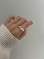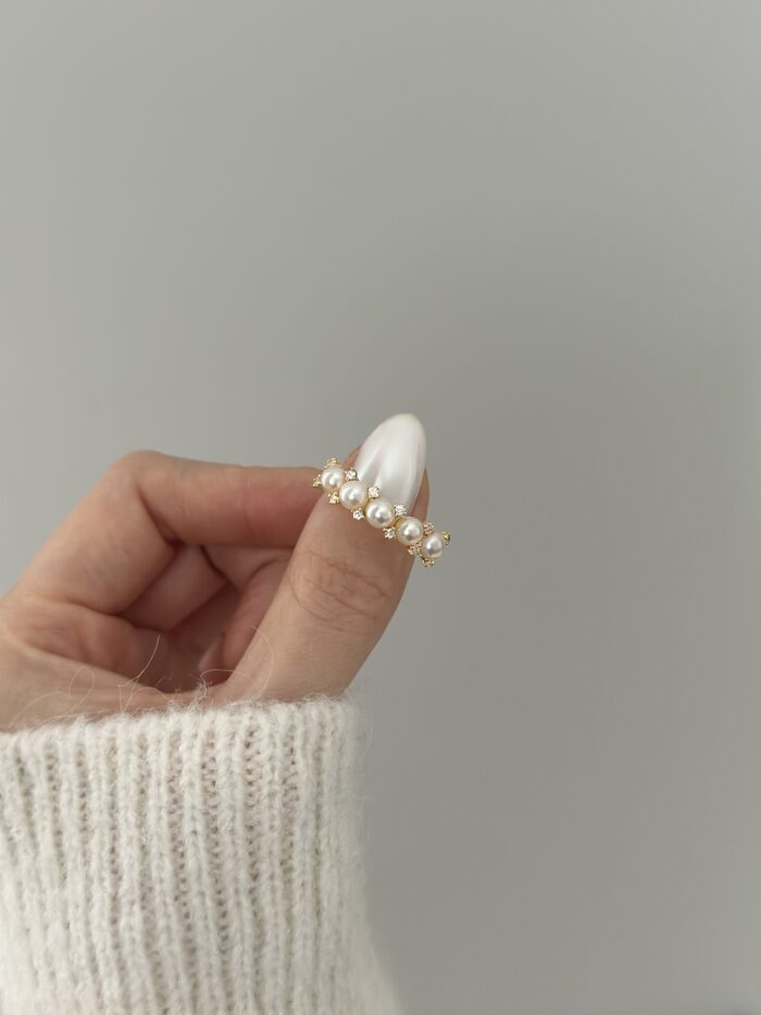 Odkryj nasz olśniewający pierścionek z naturalnymi perłami, który zachwyca swoim wyjątkowym blaskiem i doskonałością. Pięć mini pereł, pozbawionych jakichkolwiek niedoskonałości, harmonijnie uzupełnia ozdobioną lśniącymi cyrkoniami oprawę. Całość dopełnia 18-karatowe złocenie, które dodaje pierścionkowi luksusowego charakteru.