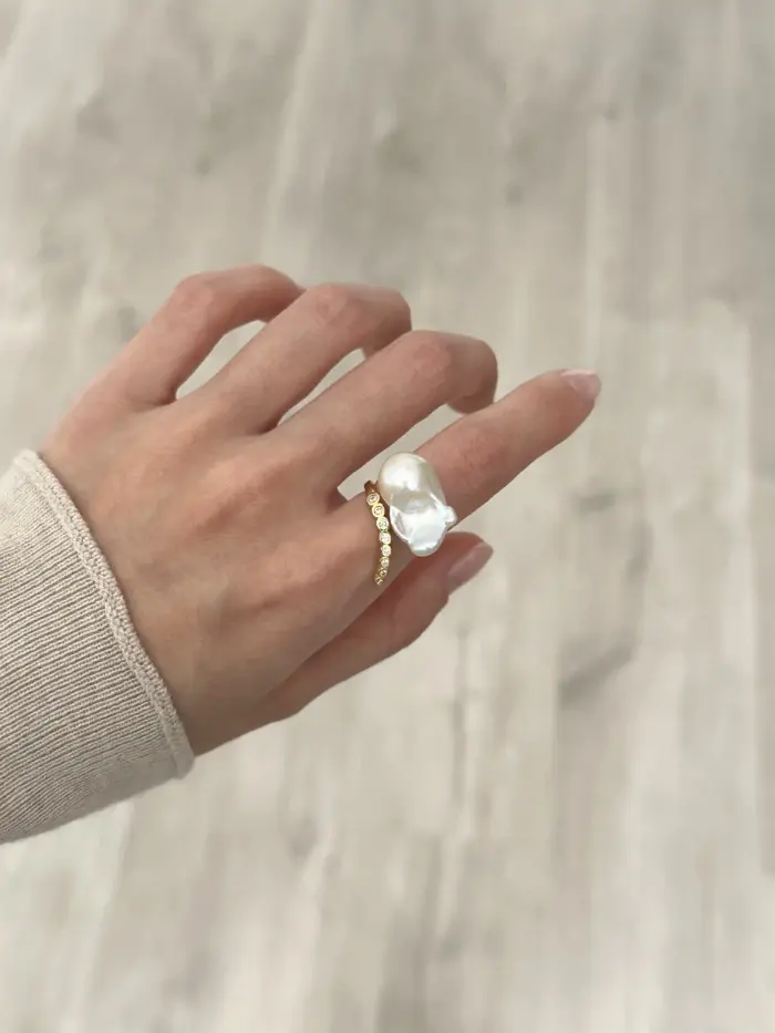 Wyjątkowy pierścionek wykonany ze srebra próby S925, ozdobiony naturalną perłą barokową, która została osadzona w poprzek palca, tworząc nowoczesną i nietypową kompozycję. Całość dopełniają błyszczące cyrkonie, które dodają blasku i elegancji. Niepowtarzalny kształt każdej perły sprawia, że każdy egzemplarz pierścionka jest unikalny. To doskonały wybór dla kobiet, które cenią sobie oryginalność, delikatność i ręcznie wykończoną biżuterię o wyjątkowym charakterze. Idealny jako prezent na wyjątkową okazję lub stylowy dodatek do codziennych i wieczorowych stylizacji.