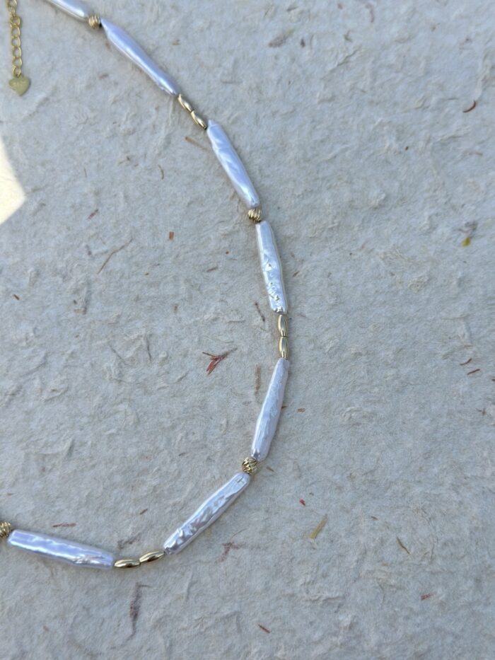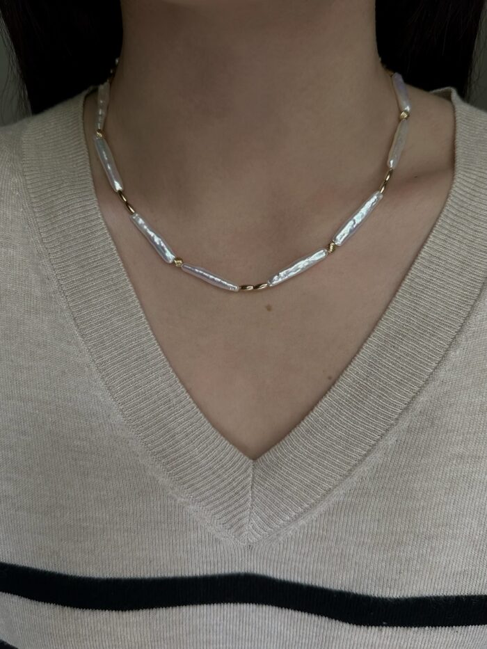 Prosty naszyjnik z podłużnych, naturalnych pereł barokowych połączonych złoconymi ogniwami. Nowoczesny, minimalistyczny styl – lekki i wygodny. Świetnie wygląda solo lub warstwowany z innymi naszyjnikami.