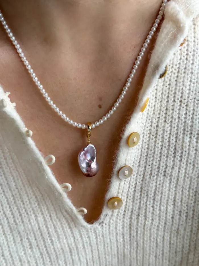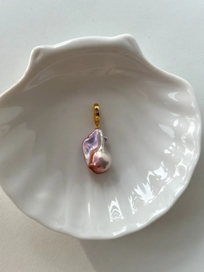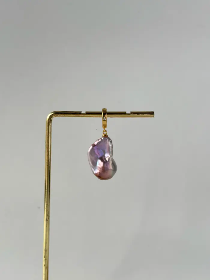 Zawieszka z perłą barokową w odcieniach srebra i fioletu to połączenie naturalnego piękna i unikalnego charakteru. Każda perła ma swój niepowtarzalny kształt, co sprawia, że biżuteria nabiera wyjątkowego uroku. Subtelne złocone wykończenie dodaje elegancji, tworząc harmonijną całość. Zawieszka idealnie sprawdzi się jako dodatek do naszyjnika lub bransoletki.